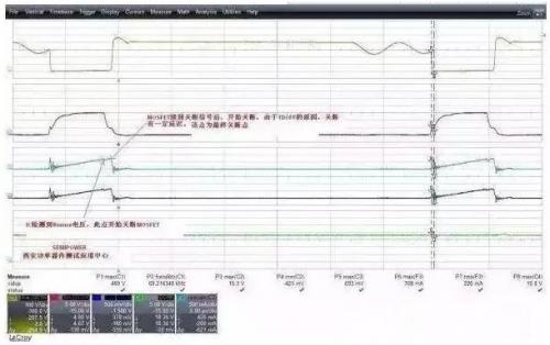 從圖中可以看出,電流波形在快到電流尖峰時,有個下跌,這個下跌點后又有一段的上升時間,這段時間其本質就是IC在檢測到過流信號執行關斷后,MOSFET本身也開始執行關斷,但是由于器件本身的關斷延遲,因此電流會有個二次上升平臺,如果二次上升平臺過大,那么在變壓器余量設計不足時,就極有可能產生磁飽和的一個電流沖擊或者電流超器件規格的一個失效。