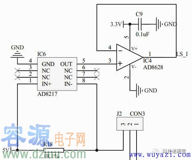 所以,我就用運放接了一個電壓跟隨器,因為放大器接的電源電壓是3.3V,它的最大輸出超不過3.3V,即使當AD8217的OUT輸出大于了3.3V,放大器的輸出也不會大于3.3V。