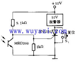 下圖是用晶閘管作驅(qū)動(dòng)器的光控報(bào)警器。在有光照時(shí),光敏三極管導(dǎo)通,晶閘管因門極為低電平而呈關(guān)斷狀態(tài),報(bào)警器不響。當(dāng)光披遮斷時(shí),光敏三極管截止,輸出高電平使晶閘管導(dǎo)通,報(bào)警器嘯叫。為使報(bào)警器停止嘯叫,可將S瞬時(shí)閉合,使晶閘管截止。