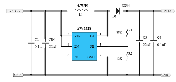 兩款2V升5V的芯片電路圖: PW5100升壓芯