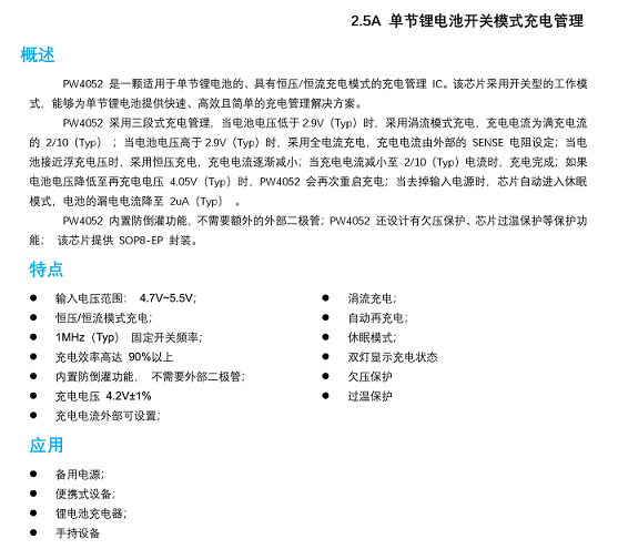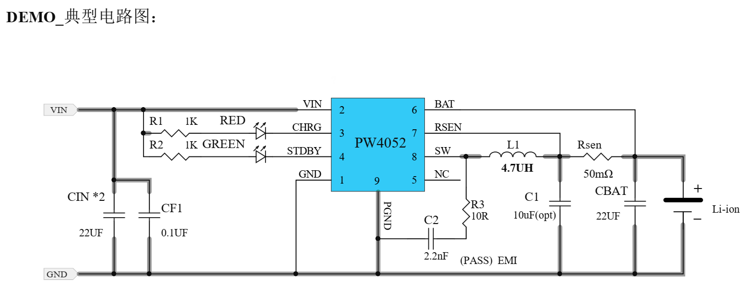 例如PW4052單節(jié)2.5A充電管理芯片的電路圖中的R3和C2。