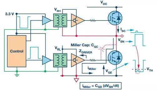 一般而言,有兩種方法可以解決逆變器IGBT的感應(yīng)導(dǎo)通問題——使用雙極性電源或額外的米勒箝位。在柵極驅(qū)動器隔離端接受雙極性電源的能力為感應(yīng)電壓瞬變提供了額外的裕量。例如,–7.5 V負(fù)電源軌表示需要大于8.5 V的感應(yīng)電壓瞬變才能感應(yīng)雜散導(dǎo)通。這足以防止雜散導(dǎo)通。另一種方法是在完成關(guān)斷轉(zhuǎn)換后的一段時間內(nèi)降低柵極驅(qū)動器電路的關(guān)斷阻抗。這稱為米勒箝位電路。容性電流現(xiàn)在流經(jīng)較低阻抗的電路,隨后降低電壓瞬變的幅度。針對導(dǎo)通與關(guān)斷采用非對稱柵極電阻,便可為開關(guān)速率控制提供額外的靈活性。所有這些柵極驅(qū)動器功能都對整個系統(tǒng)的可靠性與效率有正面影響。