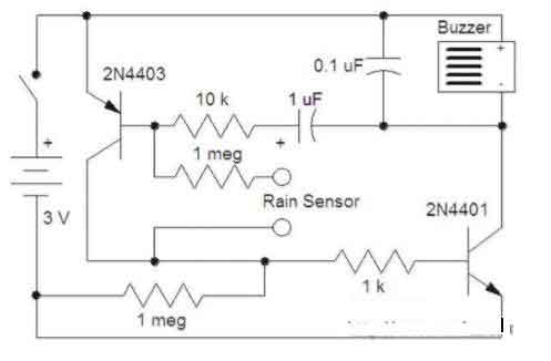 下雨(雨水)探測器電路原理如圖。這個電路使用了一個傳感器,傳感器是用一小塊敷銅板蝕刻而成,這個是一個簡單可控硅電路用來檢測下雨,并發出蜂鳴聲。可控硅也可用來觸發一個繼電器,打開一盞燈,或者發送一個信號到安全系統。