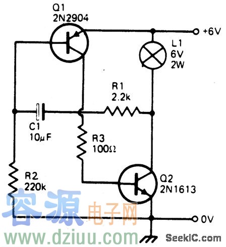 這個簡單的電路將會在6V的燈泡上閃爍,它的發光率是由電容器C1的尺寸所決定的。這是最經濟的電源,因為只有當電燈開啟的時候它才吸收電流。當燈關閉時,兩個晶體管就偏置關閉了。 :