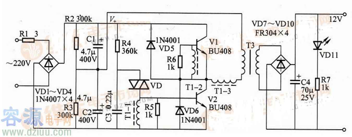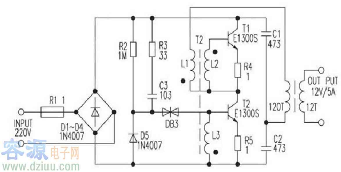 本電子變壓器工作原理與開關電源相似,電路原理圖見圖1,由VD1-VD4將市電整流為直流,再把直流變成幾十千赫茲的 高頻電流,然后用鐵氧休變壓器對高頻、高壓脈沖降壓。圖中R2、C1、VD5為啟動觸發電路。C2、C3、L1、L2、L3、VT1、VT2構成高頻振蕩部分。