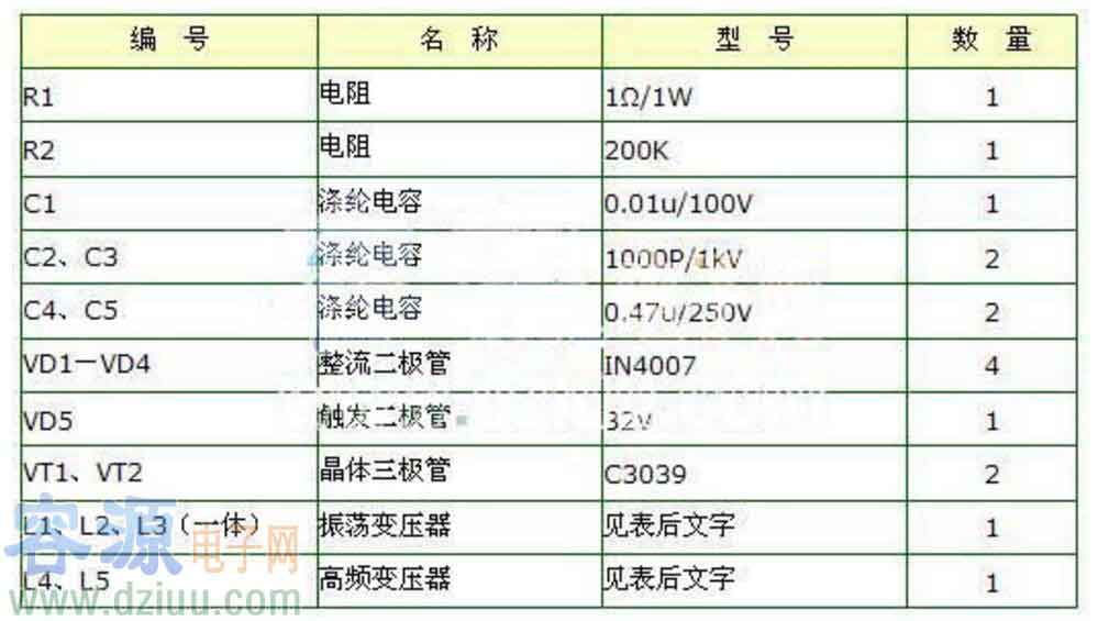 L1、L2、L3分別繞在H7&TImes;4&TImes;2mm3的磁環上,L1、L2繞6匝;L2繞1匝。L4、L5繞在H31&TImes;18&TImes;7mm3的磁環上,L4繞用Φ=0.1mm的高強度線繞340匝;L5用Φ=1.45mm的高強度線繞20匝。VT1、VT2選用耐壓BVceo≥350V大功率硅管。其它元件無特殊要求。