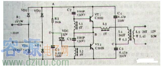 電路正常工作時,A點工作電壓約為215V,B點約為108V,C點約為10V,D點約為25V。如果不振蕩,檢查VT1、VT2及L1、L2、L3的相位是否正常(交換L3的兩根接線即刻)。改變L5的匝數可改變輸出電壓。