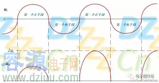 由波形圖可知,輸出電壓uo是輸入電壓ui的2倍,基于同樣的原理,也可以擴展更高倍數的倍壓電路,這樣可以從低電壓獲取高電壓,但是倍壓整流電路輸出的電流小,不適合輸出聯接重負載的情況(也就是大電流輸出的場合)
