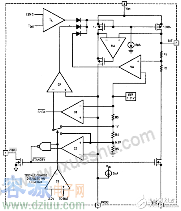 隔離二極管。熱反饋可對充電電流進行自動調節,以便在大功率操作或高環境溫度條件下對芯片溫度加以限制。充滿電壓固定于 4.2V,而充電電流可通過一個電阻器進行外部設置。當電池達