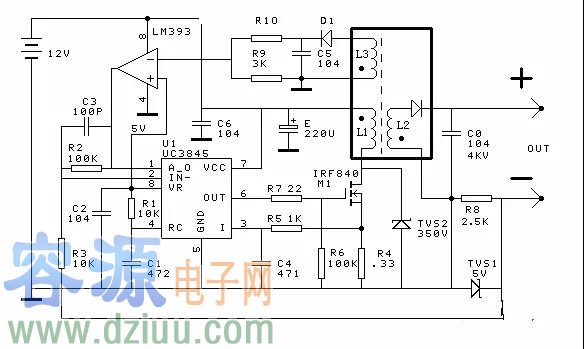 研制儀器需要一個能在0到3兆歐姆電阻上產(chǎn)生1MA電流的恒流源,用UC3845結(jié)合12V蓄電池設(shè)計了一個,變壓器采用彩色電視機(jī)高壓包,其中L1用漆包線在原高壓包磁心上繞24匝,L3借助原來高壓包的一個線圈,L2借助高壓包的高壓部分。L3和LM393構(gòu)成限壓電路,限制輸出電壓過高,調(diào)節(jié)R10 可以調(diào)節(jié)開路輸出電壓。