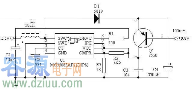 2、用MC34063做3.6V電轉(zhuǎn)9V電路圖