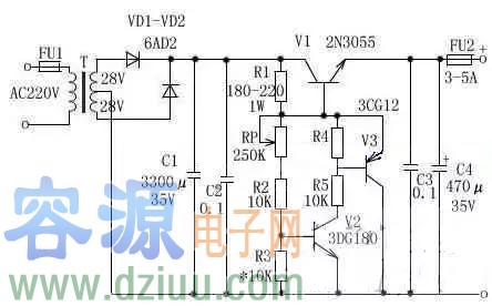 元器件選擇:變壓器T選用80W~100W,輸入AC220V,輸出雙繞組AC28V。FU1選用1A,F(xiàn)U2選用3A~5A。VD1、VD2選用 6A02。RP選用1W左右普通電位器,阻值為250K~330K,C1選用3300?F/35V電解電容,C2、C3選用0.1?F獨石電容,C4選用 470?F/35V電解電容。R1選用180~220Ω/0.1W~1W,R2、R4、R5選用10KΩ、1/8W。V1選用2N3055,V2選用 3DG180或2SC3953,V3選用3CG12或3CG80