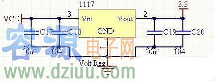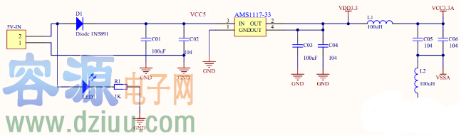 以下是用穩壓芯片將5V的電源轉換成3.3V的電壓電路原理圖。