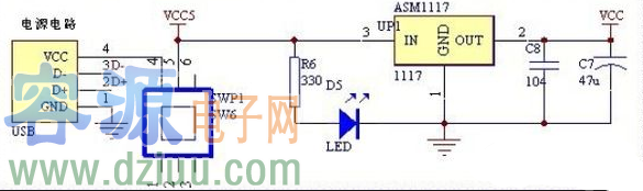 R6是D5的限流電阻,作用是使顯示發光二極管D5在上電時能工作在正常的狀態下;C7和C8都是輸出濾波電容,作用是減小輸出電壓汶波并抑制ASM1117的自激振蕩,C8是高頻濾波電容,C7是低頻濾波電容。圖中已經標出了C8容量是0.1微法,C7是47微法,R6的阻值是3030歐。