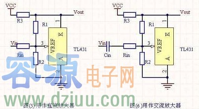 圖(5)顯示了一個用TL431組成的直流電壓放大器,這個電路的放大倍數由R1和Rin決定,相當于運放的負反饋回路,而其靜態輸出電壓由R1和R2決定。這個電路的優點在于,它結構簡單,精度也不錯,能夠提供穩定的靜態特性。缺點是輸入阻抗較小,Vout的擺幅有限。
