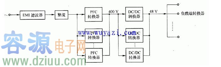 系統(tǒng)由前端轉換器和后端轉換器組成:前端轉換器(Front End Converter)包括帶有功率因數校正(PFC)的AC/DC轉換器和400/48 V DC/DC轉換器,均由若干個模塊并聯(lián)組成。交流輸入電壓經過整流后,通過PFC轉換器得到400V直流電壓,然后再由DC/DC轉換器將400 V直流電壓轉換成48 V的直流電壓接到母線;后端轉換器是一組負載轉換器,或稱為POL(Pointof Load)轉換器,將48 V的母線電壓,轉換成負載所需的直流電壓,如5 V、3 V等。可見在分布式供電電源系統(tǒng)中,AC/DC和DC/DC轉換器模塊的并聯(lián)都已得到了廣泛應用。