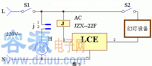 該裝置的應(yīng)用電路工作原理見下圖。在放映幻燈或電影、錄像時(shí),往往要將室內(nèi)的照明燈熄滅。放映結(jié)束時(shí),又要馬上將電燈點(diǎn)亮,利用LCE模塊可能很方便地實(shí)現(xiàn)這種自動(dòng)轉(zhuǎn)換。