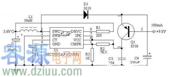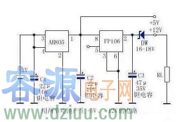 兩節1.5V堿性電池輸出的3V電壓輸入AH805,AH805輸出+5V電壓,其一路作5V輸出,另一路輸入FP106使其產生28~30V電壓,經穩壓管穩壓后輸出+12V電壓。