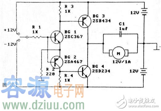 圖1電路利用了達(dá)林頓《www.6600560.cn》晶體管擴(kuò)大電機(jī)驅(qū)動(dòng)電流,圖示電路將BG1的5A擴(kuò)流到達(dá)林頓《www.6600560.cn》復(fù)合管的30A,輸入端可用低功率邏輯電平控制。上述電路采用的驅(qū)動(dòng)方式屬傳統(tǒng)的單臂驅(qū)動(dòng),它只能使電機(jī)單向運(yùn)轉(zhuǎn),雙臂橋式推挽驅(qū)動(dòng)可使控制更為靈活。