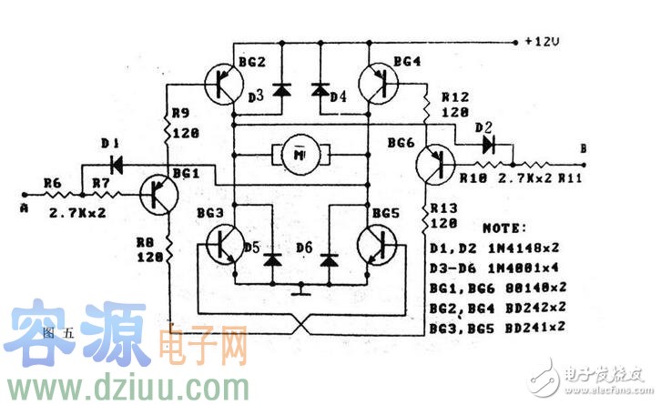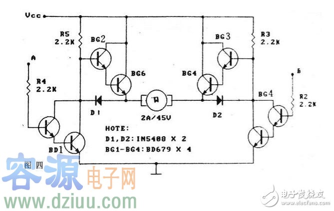 圖4電路以達(dá)林頓《www.6600560.cn》管為基礎(chǔ)驅(qū)動(dòng)電機(jī)的正反轉(zhuǎn),它由完全對(duì)稱的兩部分組成。當(dāng)A、B兩輸入端之一為髙電平,另一端為低電平時(shí),電機(jī)正轉(zhuǎn)或反轉(zhuǎn);當(dāng)兩輸入端同為高或低電平時(shí),電機(jī)停轉(zhuǎn);如采用脈寬調(diào)制,則可控制電機(jī)的轉(zhuǎn)速,因此圖4具有四種組合輸入狀態(tài),電機(jī)卻可以產(chǎn)生五種運(yùn)行狀態(tài)。這里箝位二極管D1、D2的加入具有重要的作用,它使達(dá)林頓《www.6600560.cn》管BG2,BG3不會(huì)產(chǎn)生失控,這在大功率下運(yùn)轉(zhuǎn)時(shí)更顯安全。本電路的另一特點(diǎn)是輸入控制邏輯電平的高低與電機(jī)的直流工 作電壓無關(guān),用TTL標(biāo)準(zhǔn)電平就能可靠地控制。
