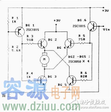 圖2為一款單端邏輯輸入控制的橋式驅(qū)動(dòng)電路,它控制電機(jī)正反轉(zhuǎn)工作,這個(gè)電路的另一個(gè)特點(diǎn)是控制供電與電機(jī)驅(qū)動(dòng)供電可以分開,因此它較好地適應(yīng)了電機(jī)的電壓要求。