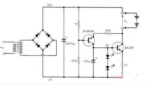 在恒定電流的系列里,給四個尺寸是 D 的電池充電,并且?guī)в凶詣与妷合拗啤C301 晶體管作為電流源,并且?guī)в谢鶚O電壓,這個電壓用 2 個 LED 穩(wěn)定在大約 3V。LED 也用來顯示充電狀態(tài)。