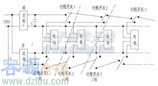 此裝置的電路如附圖所示。 一、工作原理 1.當定時器1定時開啟,電機開啟、窗簾關閉、窗簾到頭,行程開關1常閉點斷開,而常開點關閉,下一組窗簾盒開始關閉,如此可