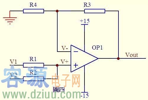 請看圖四。因為虛斷,運放同向端沒有電流流過,則流過R1和R2的電流相等,同理流過R4和R3的電流也相等。