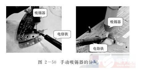 2、然后,用烙鐵對接點加熱,使接點上的焊錫熔化,同時將吸錫器靠近接點,按下吸錫器上面的按鈕,可將焊錫吸上。