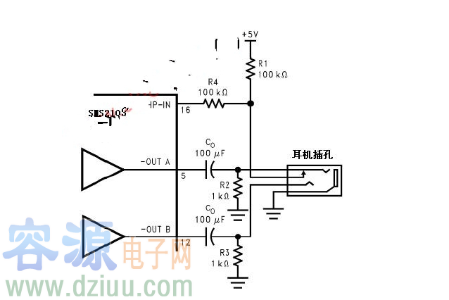 當沒有耳機插頭接入插孔時,R1-R2分壓電阻使提供到HP-IN管腳(16腳)的電壓近似為50mV,驅動Amp1B和Amp2B處于工作狀態,使HWD2163工作于橋式模式。輸出耦合電容隔離半供給直流電壓,起到保護耳機的作用。