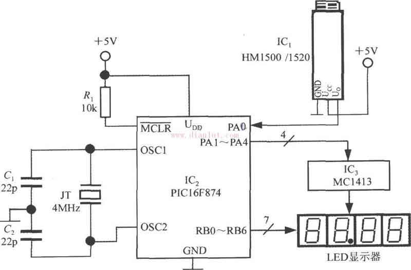 基于PIC16F874設(shè)計(jì)的電壓輸出式集成濕度傳感器電路如圖。 該儀表采用+5V電源,配4只共陰極LED數(shù)碼管。 電路中共使用了3片IC:IC1為HM1500/1520型濕度傳感器,IC2是由美國微芯片公