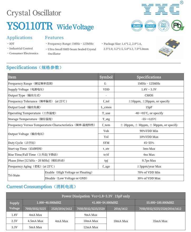 YXC晶振YSO110TR系列,頻率為8MHz,總頻差±30PPM,以下為YSO110TR系列規格書。