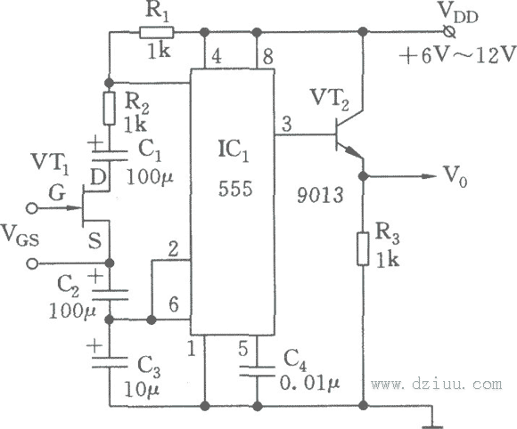 壓控振蕩電路如圖所示。555、R1、R2、C1~C3及VT1組成一個壓控多諧振蕩器,場效 應管(JFET)VT,作為壓控電阻,通過改變其門一源電壓VGs可改變VT-的漏(D)、源(S)間的阻抗。接在VT。的D、S的耦合電容C1、C2,用于防止其余電路的直流電壓對JFET的影響。為不使耦合電容影響時基電路的充、放電時間,C1、C2的大小宜選為定時電容C3容值的10倍。該電路的優點在于:通過場效應管門一源問電壓VGs的變化,使VT1形成一個可調范圍很大的可變電阻Rx(可大至幾百kΩ),從而獲得極大的占空比和周期的變化。