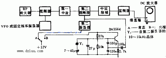 本電路使用與固定或可調(diào)FM接收機(jī)聯(lián)用的簡(jiǎn)單晶體管振蕩器及顯示載頻偏離中心頻率任一側(cè)的示波器。示波器的垂直放大器采用直接耦合。