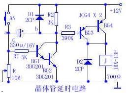 電容C被充電,充電電流經R2、C、R構成回路,a點電位上升,引起b點電位下降,b點電位的下降又限制了a點電位上升。a、b兩點電位互相補償的結果使a點電位的上升量非常小,充電電流接近似恒定。當b點電位上升到10V左右時,BG3、BG4接近截止,繼電器J釋放,延時過程結束。按一下按鈕AN,電容C迅速經D1放電,繼電器J吸合,開始下一個延時過程。