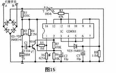 KD-156音樂集成電路可發出"叮咯"及鳥鳴兩種聲響,音響純正悅耳,是用來制作電子門鈴的專用集成電路。用這種集成電路制作的電子門鈴電路,如圖所示。圖中的A、B端為兩個觸發信號輸入端,A為正脈沖觸發端,B為負脈