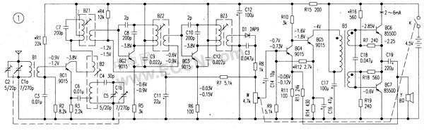的連接關系來找.從左向右看過去,此電路的有源器件為BG1(變頻管)、BG2與BG3(中放管)、BG4與BG5(低放管)、BG6與BG7(功放管),