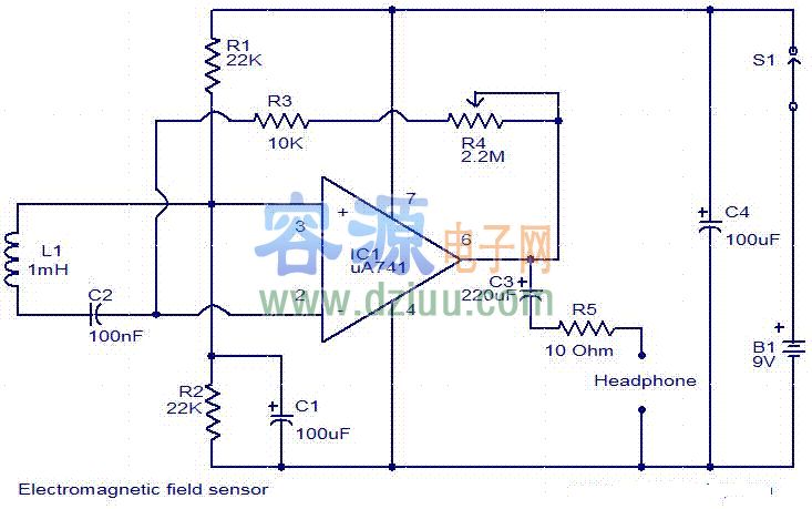 簡單電磁場傳感器電路 <<版權聲明:本文由容源電子網(www_dziuu_com)整理提供,部分內容來源于網絡,如有侵犯到你的權利請與我們聯系更正。》