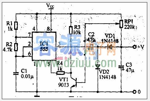 555集成電路和R1、R2、C1等組成頻率約10kHz的方波多諧振蕩器,VD1,VD2是用于整流的二極管,VT1用于反饋穩(wěn)壓。 <<版權(quán)聲明:本文由容源電子網(wǎng)(www_dziuu_com)整理提供,部分內(nèi)容來源于網(wǎng)絡(luò),如有侵犯到你的權(quán)利請(qǐng)與我們聯(lián)系更正。》
