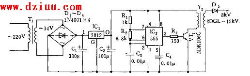 555輸出的高頻振蕩脈沖經R3限流后,加至高頻放大級VT1的基極。該放大器的負載是升壓變壓器T2,經T2的次級升壓,可使次級輸出達12KV的高壓,再經高壓堆或高壓整流管整流后,可穩定輸出 8KV的直流高壓。 <<版權聲明:本文由容源電子網(www_dziuu_com)整理提供,部分內容來源于網絡,如有侵犯到你的權利請與我們聯系更正。》