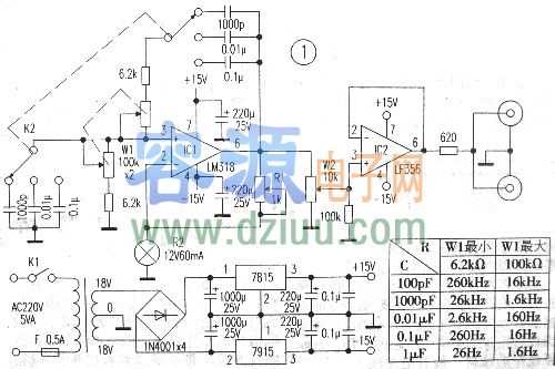 擴(kuò)大頻率范圍,可自行添加電容器;本電路最高振蕩頻率可達(dá)400KHz,但失真率達(dá)到3%。 <<版權(quán)聲明:本文由容源電子網(wǎng)(www_dziuu_com)整理提供,部分內(nèi)容來(lái)源于網(wǎng)絡(luò),如有侵犯到你的權(quán)利請(qǐng)與我們聯(lián)系更正。》