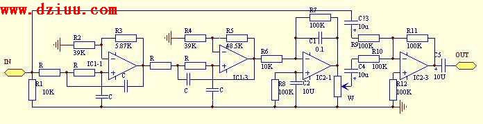 電路原理: 輸入信號(hào)經(jīng)由IC1-1、及外圍元件所組成四階低通濾波器進(jìn)行變化斜率為24db/oct的低通