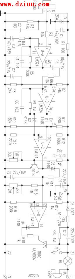 輸出高電位,通過D3、R14給C8充電,使U-D{12}腳電位高于{13}腳,其{14}腳輸出高電位觸發雙向可控硅導通,點亮電燈。 <<版權聲明:本文由容源電子網(www_dziuu_com)整理提供,部分內容來源于網絡,如有侵犯到你的權利請與我們聯系更正。》