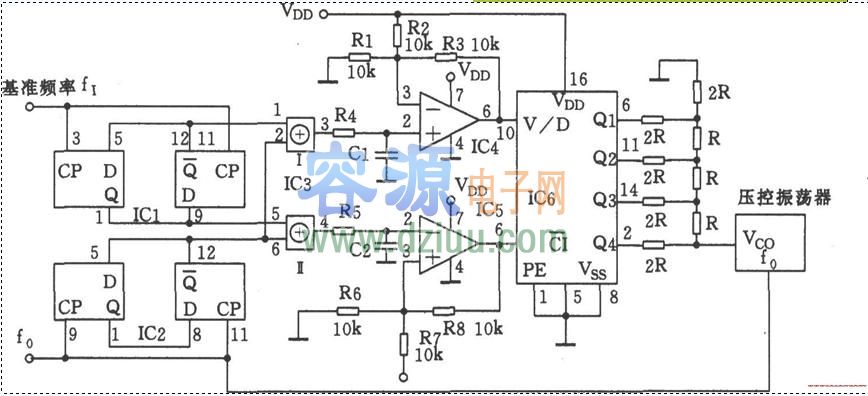 本電路的主要作用是把分相器和數/模轉換器結合起來,可使高穩定度的壓控振蕩器與外部的基準頻率精確地同步 <<版權聲明:本文由容源電子網(www_dziuu_com)整理提供,部分內容來源于網絡,如有侵犯到你的權利請與我們聯系更正。》