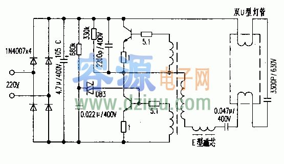 電子鎮流器電路圖。詳細介紹如下: <<版權聲明:本文由容源電子網(www_dziuu_com)整理提供,部分內容來源于網絡,如有侵犯到你的權利請與我們聯系更正。》