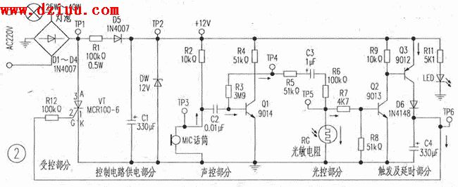 而在白天,光線強時,無論環境中有沒有聲音,都不會啟動開關,燈泡自然也不會亮,達到節能的目的.下載為大家提供聲光控制開關電路圖本文由www.6600560.cn整理提供,部分內容來源于網絡,如有侵犯到你的權利請與我們聯系更正。