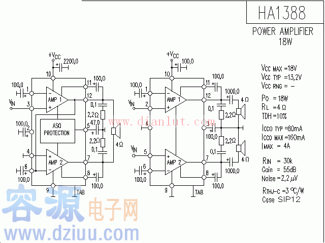HA1388是音頻功率放大集成電路,應用電路,采用12腳單列直插塑料封裝結構。具有很多優點,該電路在電源電壓13.2V、 4負載阻抗和10%失真時,輸出功率為l8W。 :