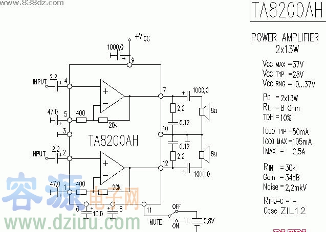 TA8200AH功放電路圖紙原理圖解。TA8200AH功率放大器應用線路圖最高工作電源電,37V 輸出功率2×13W,典型工作電源電壓28V 正常工作電壓10-37V,Noise 輸出噪聲,Icoo TYP典型靜態電流