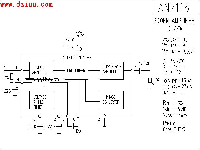制作,電路參數都標在AN7116功放電路圖中,請你參考,工作電壓最大是9V,最大工作電流是23MA,AN7116功放集成塊外圍元器件只有7 個器件,希望本電路能對功放DIY的朋友有