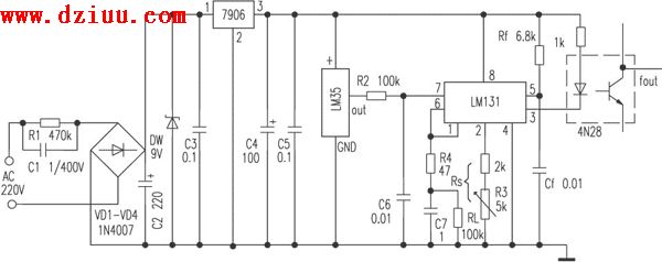 電路見附圖。溫度傳感器LM35將其接收到的溫度信號轉(zhuǎn)換成電壓信號輸出。然后通過一個LM131,將其接收到的從LM35輸出的電壓信號轉(zhuǎn)換成頻率信號后輸出,其輸出頻率可通過下面的公式進(jìn)行計算: 《版權(quán)聲明:本文由www.6600560.cn整理提供,部分內(nèi)容來源于網(wǎng)絡(luò),如有侵犯到你的權(quán)利請與我們聯(lián)系更正。》